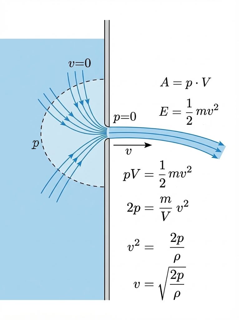 When solving physics problems at school, I used a standard formula for the velocity of a jet pouring out of a hole, given the pressure inside the liquid and its density. But for a long time I couldn’t really derive this expression myself. And now I understand why.