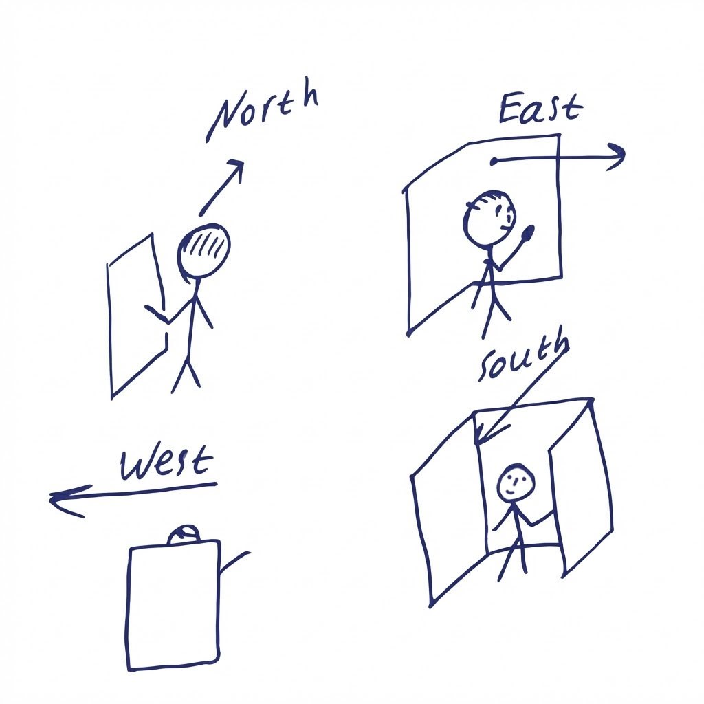Our initial direction - East. +1 - counterclockwise, -1 - clockwise. God bless Guido van Rossum - % 4 always gives numbers from 0 to 3 inclusive. In C++ it would be slightly less straightforward.