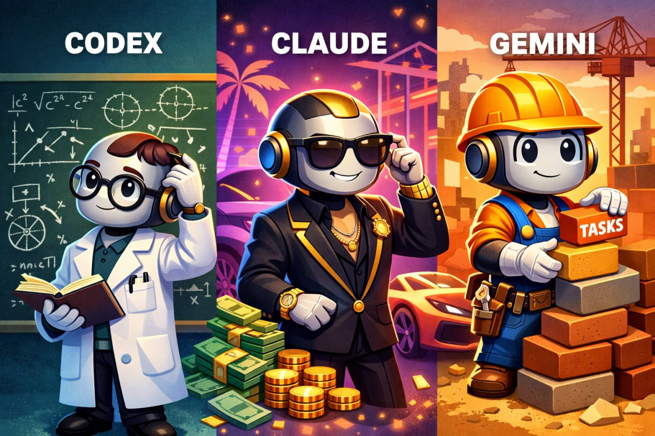 For me now they have three personalities: Claude is a stingy person who promises to perform a task if you pay, but you don't see results. Codex is a very smart person, like a professor from a Disney movie. It's very nice to talk to him, and he can solve your problem, but you have to remind him who you are. Gemini is a worker. If it has a nice instruction, everything will be done quickly and with nice quality.