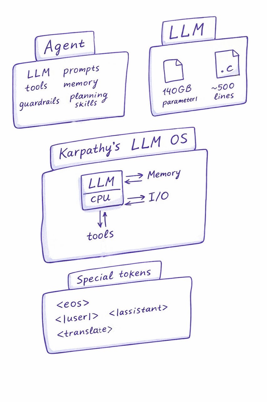 In an agent, the LLM works like a CPU on a motherboard. It processes data in different modalities, acts through tools, and performs Input/Output operations. This "OS" thing sounds wrong to me. An OS is the first program that starts on your computer when you turn it on. A CPU on a motherboard suits this analogy much better.