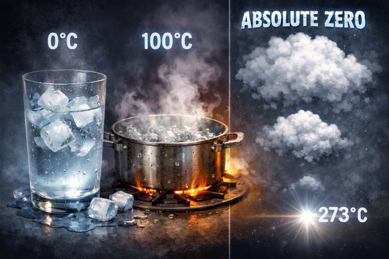 A piece of totally impractical, but dear to me, knowledge is the following. If we take the melting point of water and its boiling point as reference points, divide the whole range into 100 equal parts using an expanding liquid like mercury as a measure, then a decrease in temperature by 1 degree Celsius leads to the gas shrinking by approximately 1/273 of its volume at 0 degrees Celsius. So absolute zero is the point at which the gas shrinks to nothing.