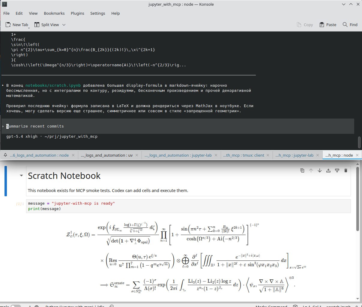 I tried a few ways of working with an LLM inside JupyterLab: magic commands, editing files through Codex, even using Cursor. All of them felt like different shades of “this is not what I actually want.”