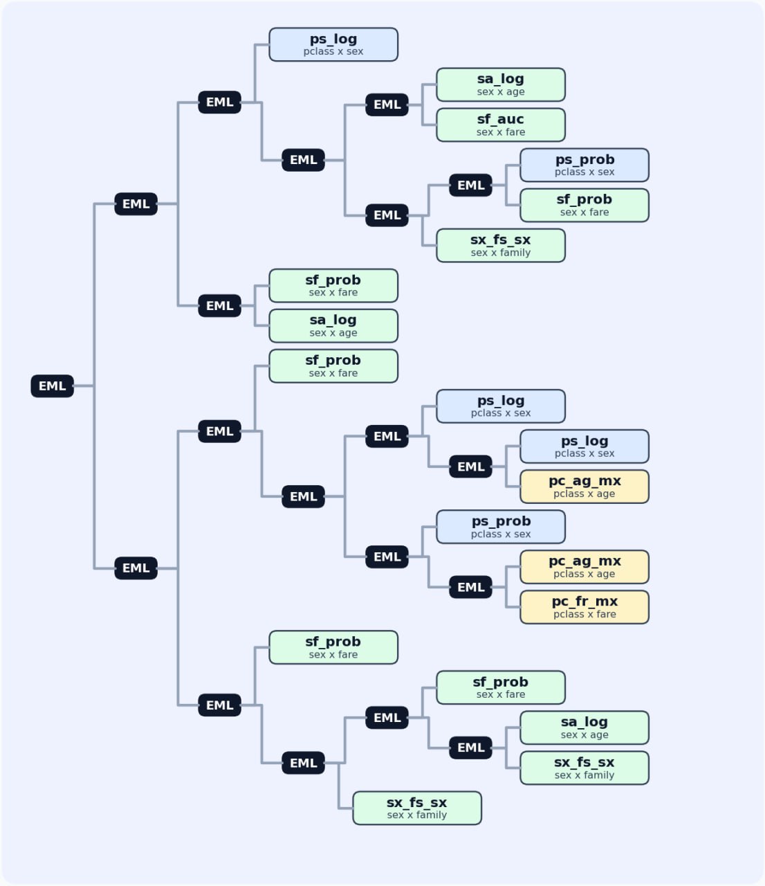 But I totally think that it was worth it. As a result, we have something as precious as a talking frog: an EML tree which solves the Titanic dataset, and the understanding that notation like (1(x (x (1 1)))) enumerates mathematical expressions and therefore, ML models.