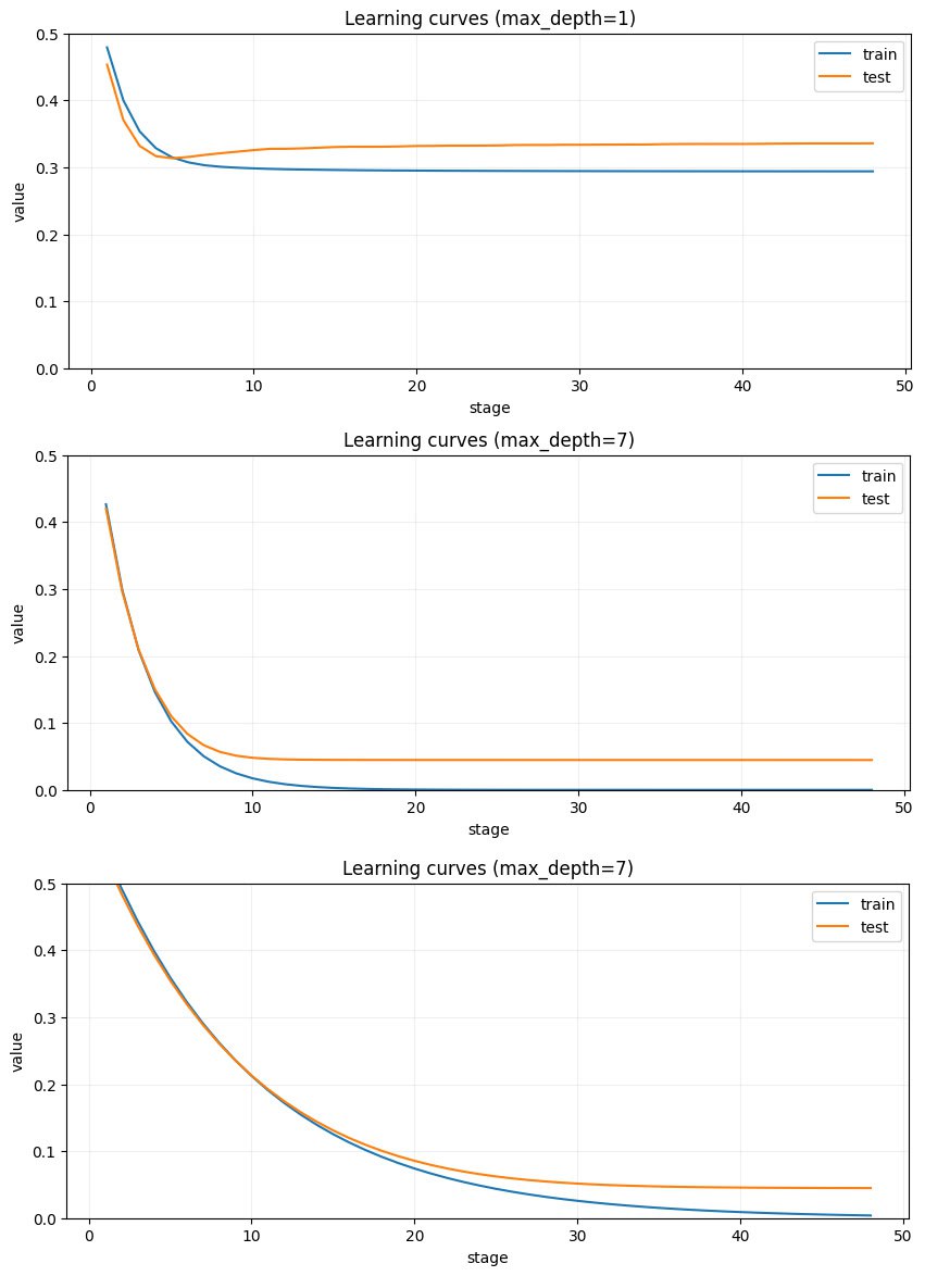 In this dataset we know the exact number of factors to work together—7—and we can test that intuition. And that's exactly the story these three plots are telling us. At the top—trees have only two levels. The model has a limited ability to learn, and we see classic learning curves: the model grasps some generic knowledge and both train and test curves go down. Then it starts to learn noise and the test curve goes up. We can see that, because of the low depth, it can't fit the train set with good quality. It's exactly what we saw in the previous post on the plot "predicted values on train data."