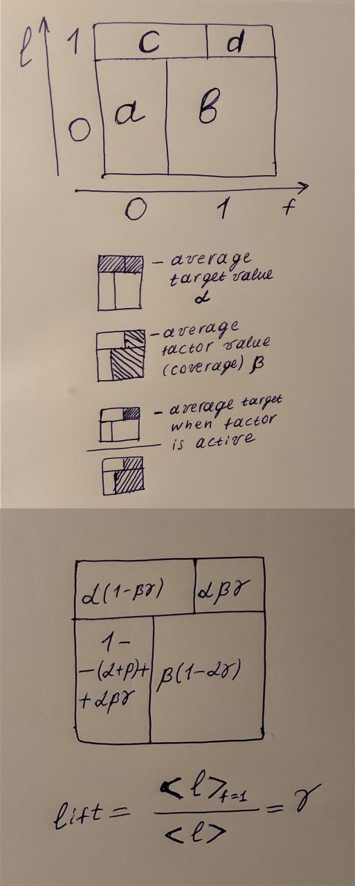 And finally, the lift. It's a ratio: in the numerator is the probability that the target equals 1 when the factor equals 1, and in the denominator is the average target value. In terms of our variables, d/(d+b) is the average target when f = 1, and α is the average target value.