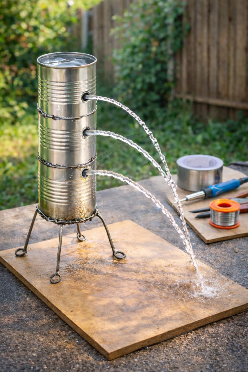 В какой-то момент мне удалось найти три консервные банки, срезать с них крышки и сварить в одну трубку. Но по каким-то причинам проект так и не пошел дальше. Я не могу вспомнить точную причину. Скорее всего мне не удалось сделать швы идеально водонепроницаемыми, а перфекционист внутри меня не дал закончить эксперимент. А жаль — теперь я понимаю, что до завершения установки был буквально один шаг, а швы вообще не требовали полной водонепроницаемости.
