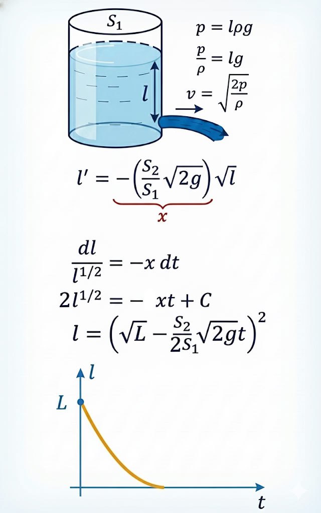 Здесь, когда истечение ограничено не вязкостью, а инерцией, экспоненциальный закон превращается в параболу — и жидкость покидает сосуд за конечное время.