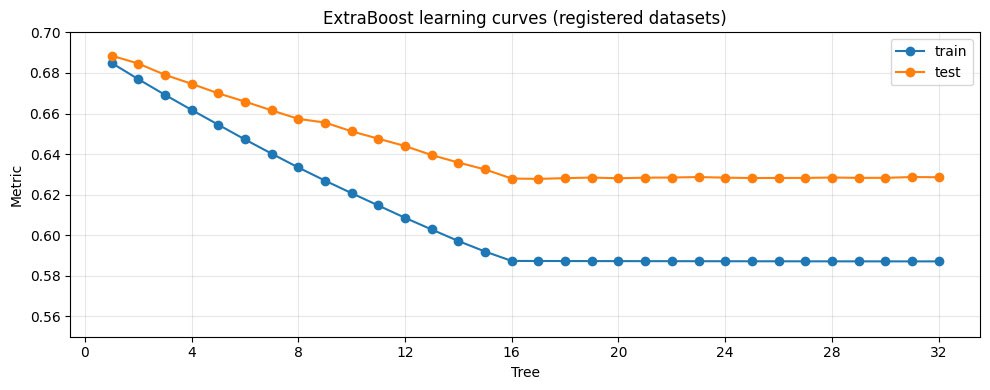 Первая гипотеза: первые 8 деревьев в основном используют одну группу признаков, а примерно на шаге 9 модель впервые переключается на другую. Тогда следующий вопрос - почему эта группа хуже обобщается? Признаки слабее, шумнее, сильнее коррелируют или как-то странно взаимодействуют с train/test split?