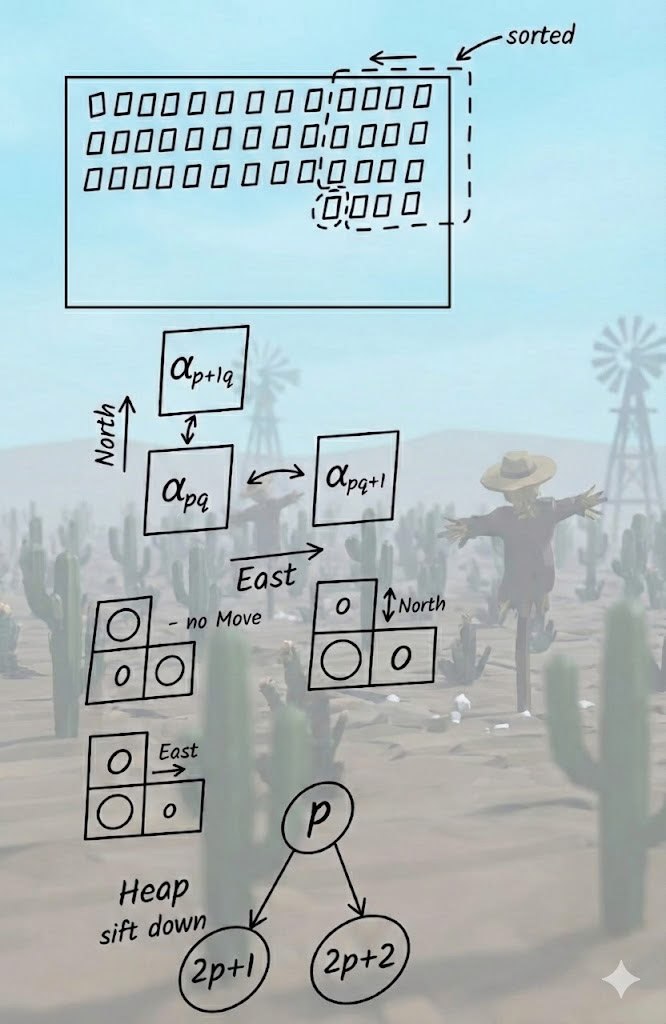 За одну итерацию сортировки наша задача — переместить a[p][q] на его место внутри уже отсортированного фрагмента и не нарушить уже имеющийся порядок.