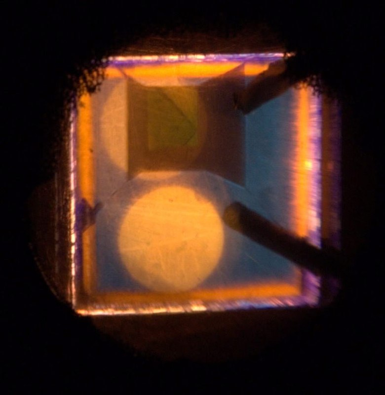 Это фотография из моей прошлой жизни в качестве физика. Честно говоря, это один из величайших сюрпризов в моей жизни. Вы берете чистый, как стекло, кусок алмаза — совершенно прозрачный и однородный. Вы помещаете его в электронный микроскоп, закрываете крышку, заливаете жидкий азот в вакуумные насосы и ждете четыре часа. Потом вы запускаете и настраиваете электронно-лучевую систему, охлаждаете держатель образца жидким азотом, настраиваете оптическую систему — и тогда… вы видите такую картину. Это природный алмаз, и сектора роста четко видны. Вы можете увидеть синие, оранжевые и зеленые линии свечения.