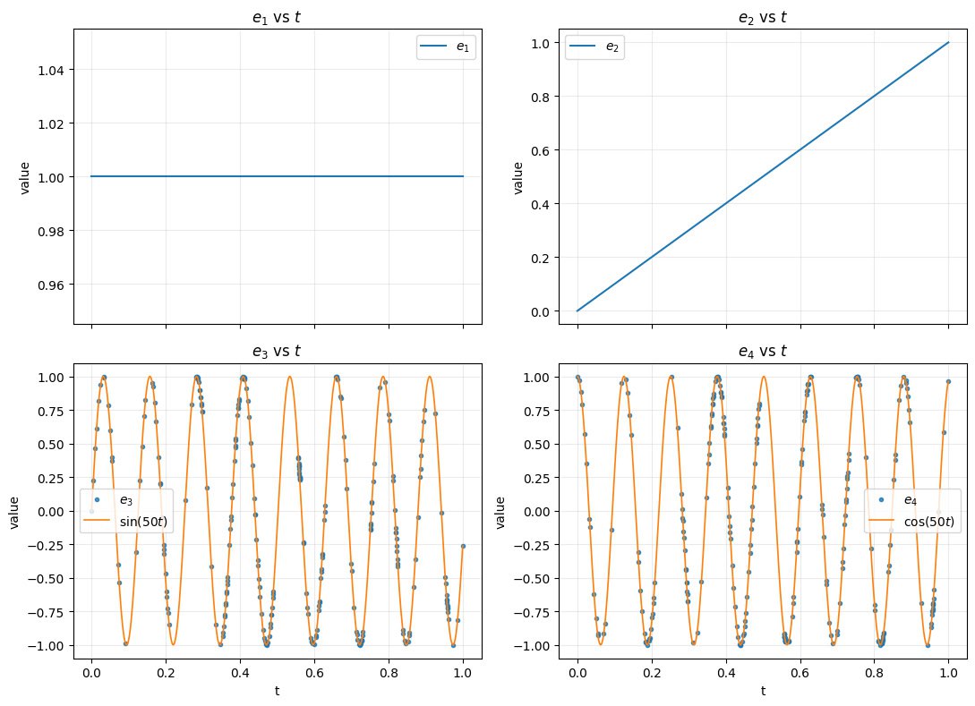 Для построения набора данных MSE я использовал четыре базисные функции: 1, t, sin(50t), cos(50t). Почему эти четыре?