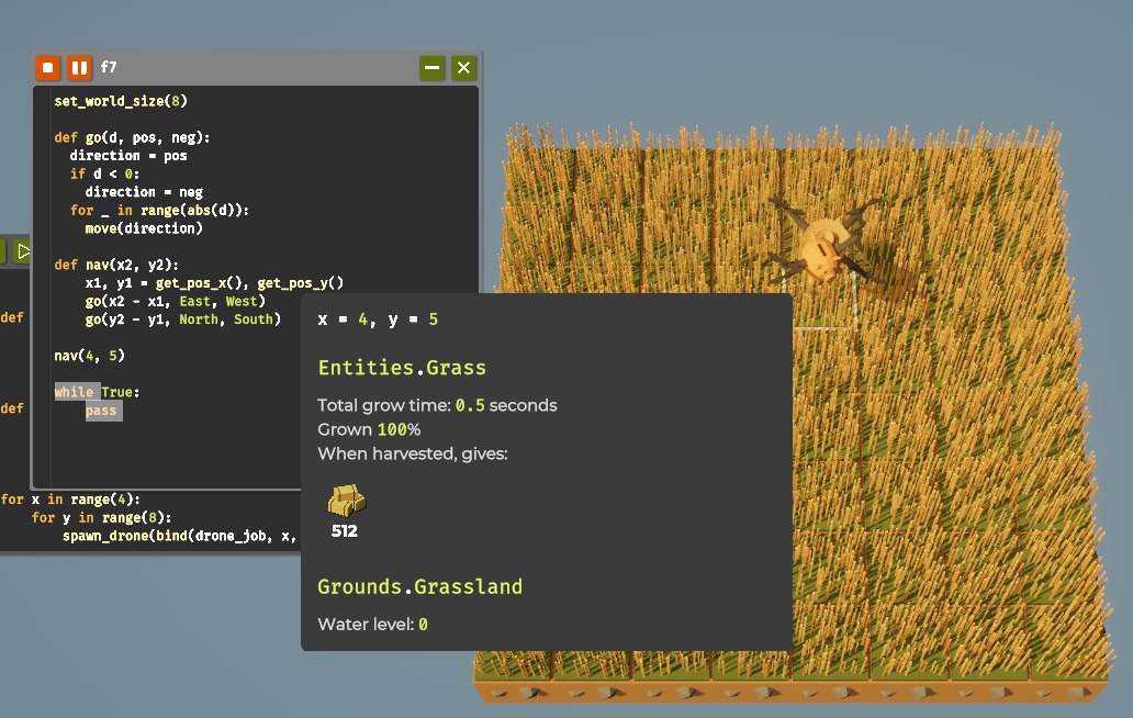 Для управления дроном есть функции get_pos_x(), get_pos_y() и move(). move() принимает команды East (x + 1), North (y + 1), West (x - 1) и South (y - 1). get_world_size() тоже полезна: мир квадратный, поэтому одного числа (длины стороны) достаточно.